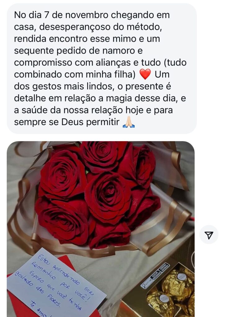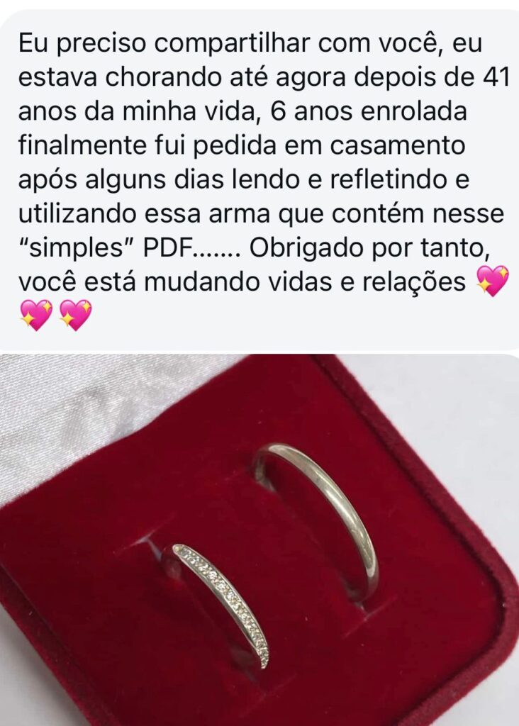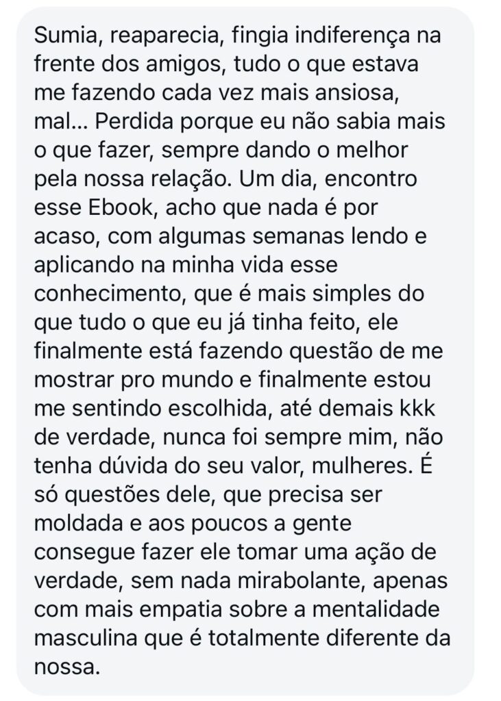 Não é magia. É método. Um método que ensina, passo a passo, como sair da posição de “dúvida” e entrar na posição de “decisão” na mente dele. Em poucas semanas, o mesmo homem que hoje te deixa no vácuo, será aquele que para de ter dúvidas. Que para de sumir. Que te procura com constância. Porque ele finalmente vai ENXERGAR em você o que você sempre soube que merecia: um lugar definitivo.